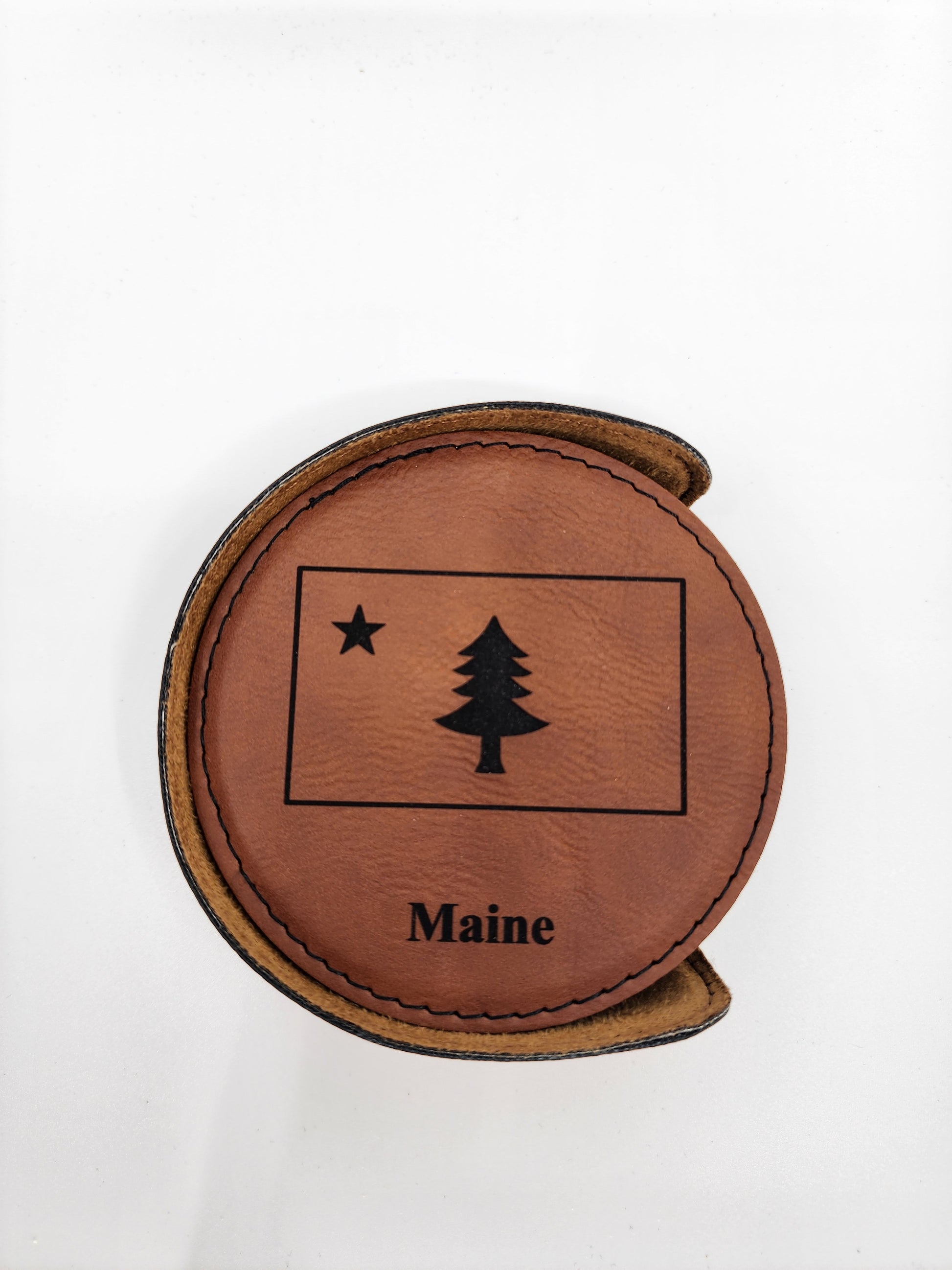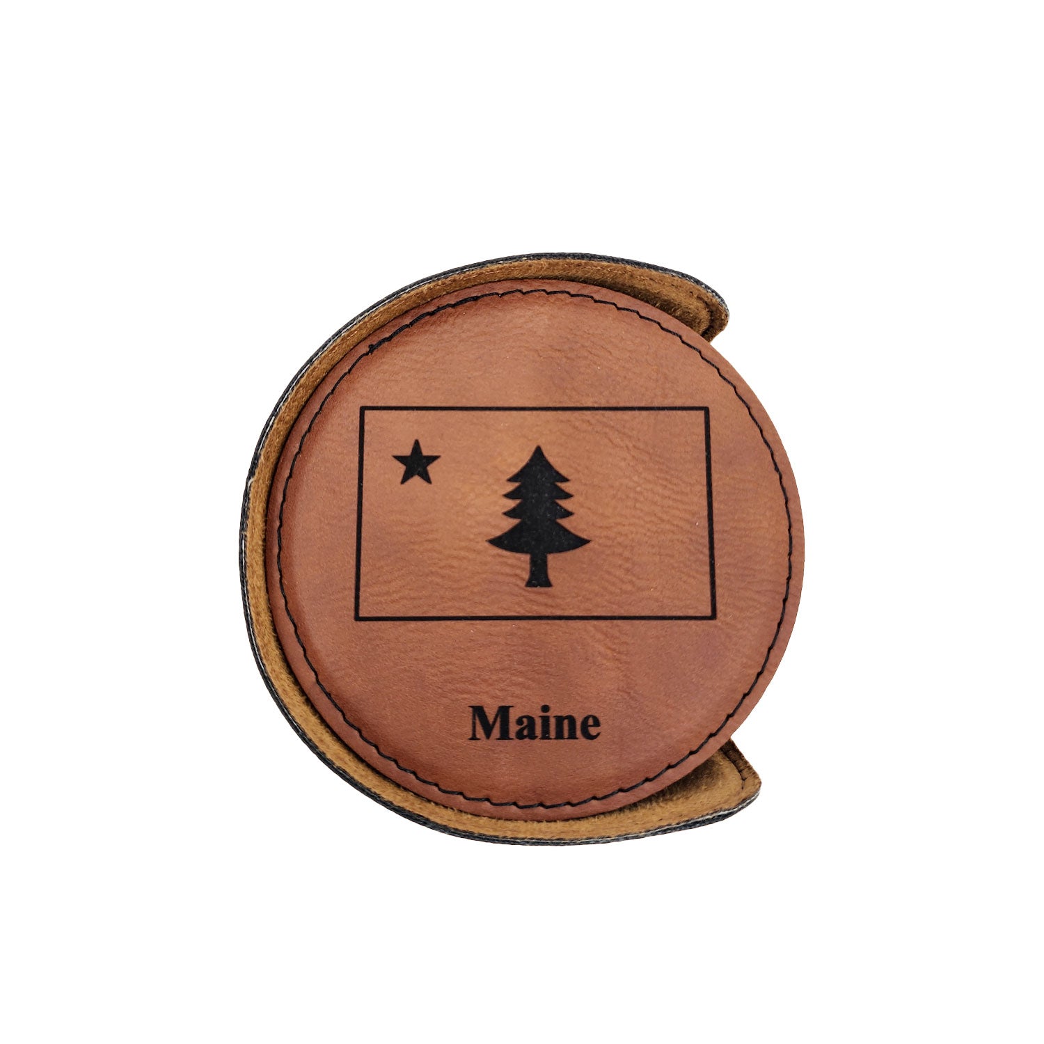 Let your love of Maine shine with the Rawhide Maine Coaster Set! This unique set of six coasters, crafted with rawhide and featuring the 1901 Maine flag, were made in Maine and proudly brought to you by Beebow. Plus, all your coasters come in a handy storage case! Show your Maine pride with the Rawhide Maine Coaster Set.