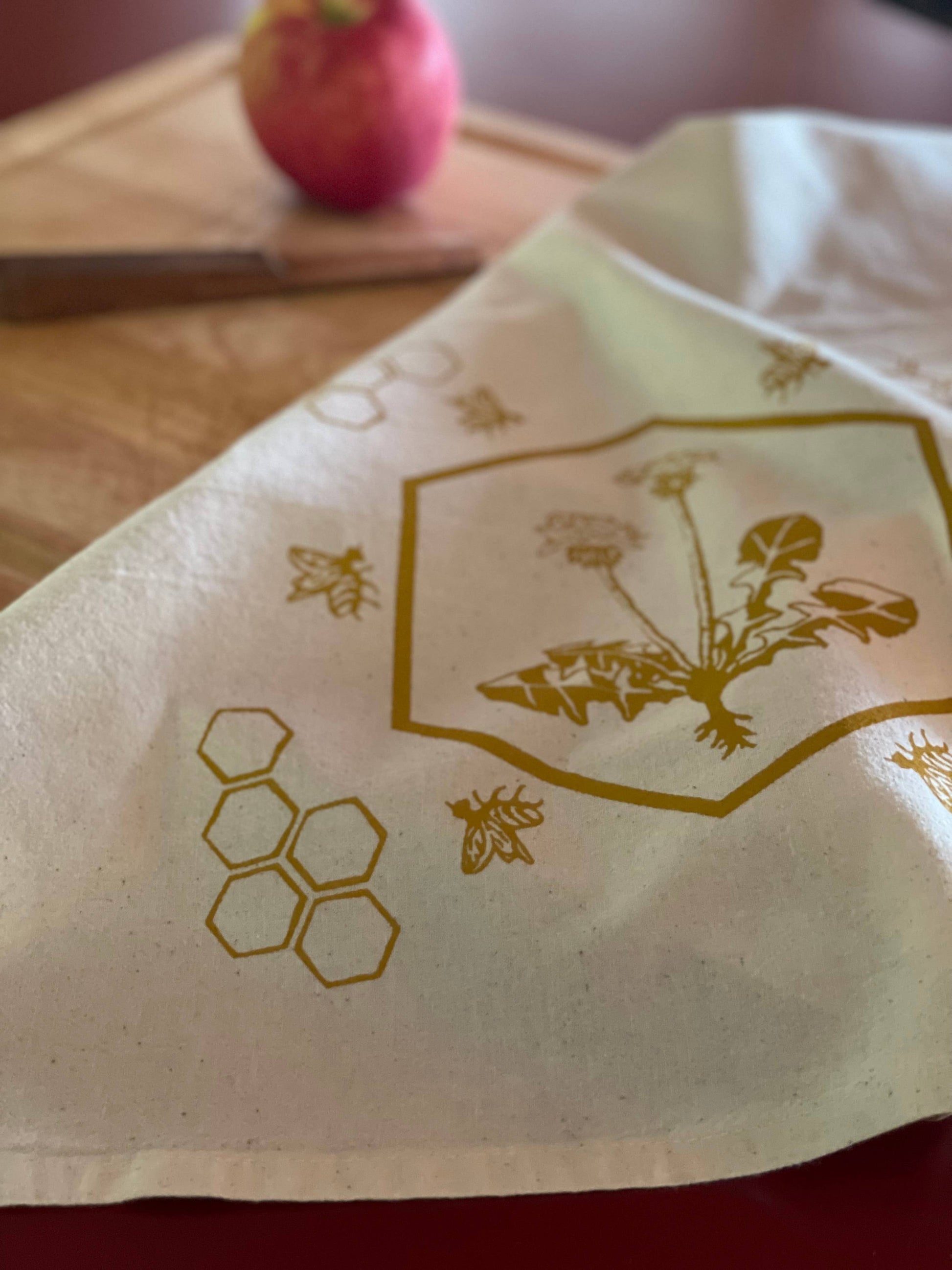 This unique dandelion flower honey bee design is handprinted onto a 16” x 24” flour sack 100% cotton tea towel. There is a loop at the top to hang or you can drape it over your oven door handle. Colors will not fade in the wash and can be cleaned and put in the dryer with other laundry.