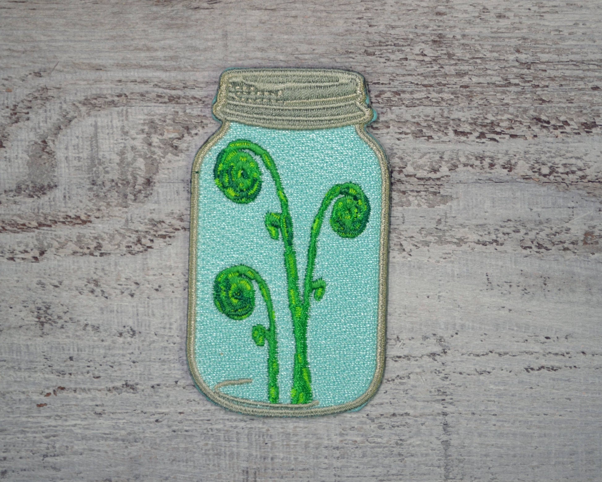 The Fiddlehead in Mason Jar Patch is embroidered and has an iron-on backing or can also be sewn on. Each patch comes individually packaged in a plastic sleeve with a hangtag for easy display. A postcard is included in the packaging giving ideas on where patches can be used. 2.5” x 3.5”
