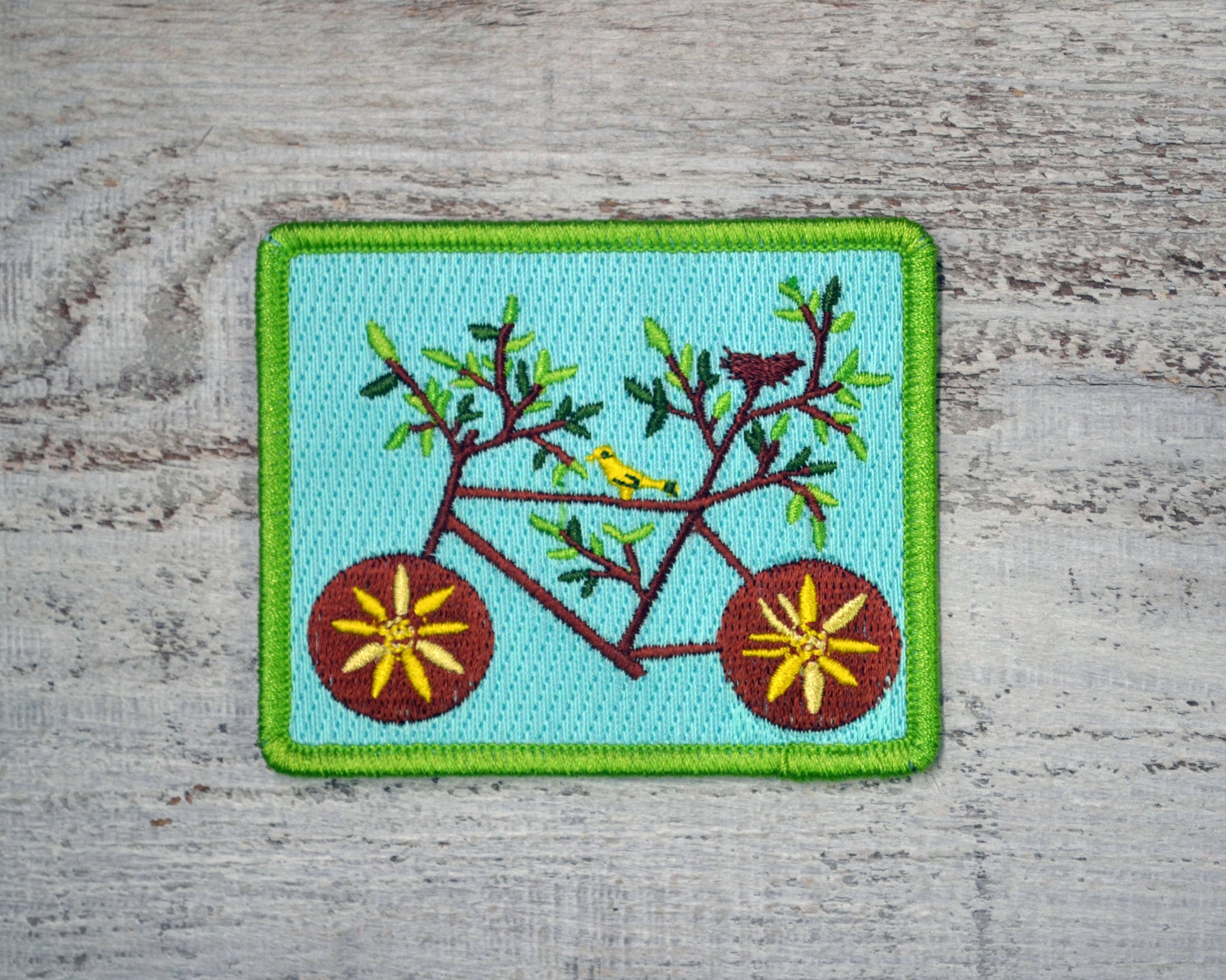 The tree bike patch is embroidered and has an iron on backing or can also be sewn on. Each patch comes individually packaged in a plastic sleeve with a hang-tag for